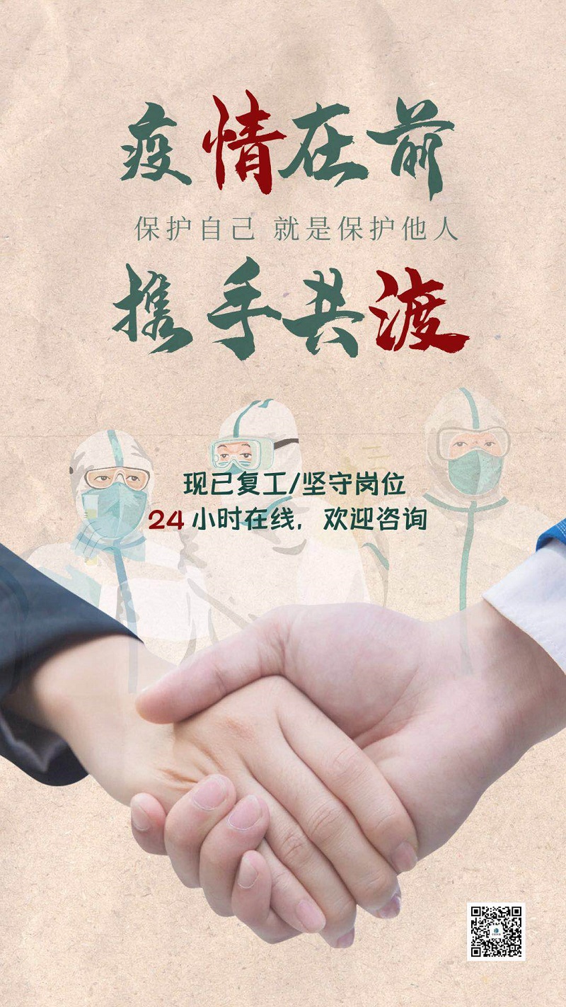 你好!鑒于疫情的影響,為保護員工生命安全,經政府相關部門要求和公司研究決定:我司重要部門于2月24日正式開工,部分員工和區域分公司(辦事處)復工時間以當地政府規定時間為準。同時為了做好客戶服務工作,我們啟動了遠程客戶服務響應機制,服務方式以QQ、微信、電話、視頻會議等為主。